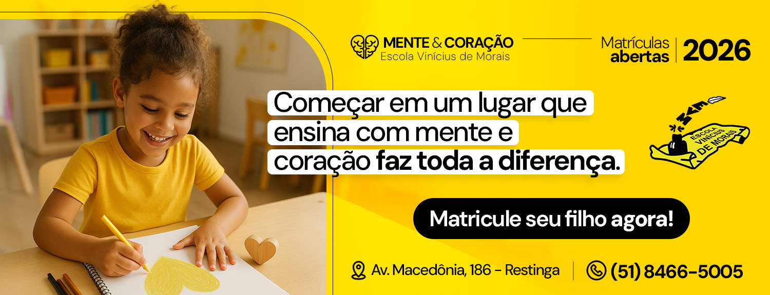 Fundada há 32 anos, a Escola Vinícius de Morais tem sido um farol de educação e desenvolvimento para inúmeras gerações de estudantes. Nossa equipe dedicada de educadores está empenhada em proporcionar um ambiente de aprendizado estimulante, que promove não apenas o conhecimento acadêmico, mas também valores como respeito, responsabilidade e cidadania.